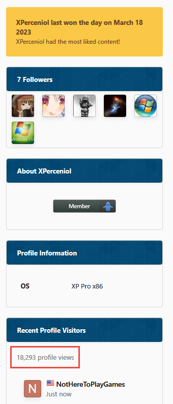 It's not rocket science. The "views" on MSFN are cheated, rigged, manipulated. Meaningless, as even our mods point out. I agree with YOU, they are there for us members to read, they are supposed to tell us something. I'm telling you that they are *FAKE*. We have people (they know who they are) that visit the "profile" page to keep track of how many DECADES they have to go back to post a "like" they haven't yet posted. I can do the same. Four people live in this house. It isn't against forum rules for those other three people to register an account here and start viewing my profile daily and rack up their daily limit of "likes". Here, I'll show you. 100+ "views" in less than two minutes of my time. Just visit and refresh the page a few times. Notice that the count jumps TWO INCREMENTS for every ONE refresh. On a profile who is no longer an active member because he cannot log in due to email now required. "Auto Refresh" scripts are a piece of cake. I can "view" my profile once per minute for my 6hrs of sleep and return to a computer that "viewed" my profile FOUR THOUSAND THREE HUNDRED TWENTY times. Well, not my profile (I disable the recent visitors), but how 'bout yours? Do you want FOUR THOUSAND "views" by the time I cook my breakfast? It appears that a logged in member view counts as two views and a not-logged-in view counts as one view. Before: After: