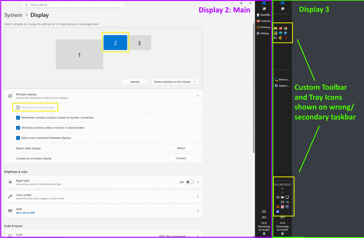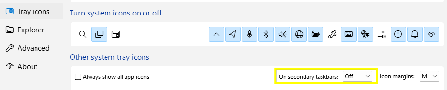 On rereading my initial post, I probably have not made my point clear enough. I have three display, using vertical toolbars on each one. Middle display is the main one. StartAllBack is configured to show Tray Icons on main toolbar only: However, even though the middle one is the main display, StartAllBack shows the Tray Icons (and Custom Toolbar) on the right display: -