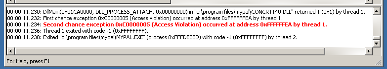 You attached KexApiLog. The Kexstub log is in the KernelEx folder next to your stubs ini. Possibility to identify RaiseException as culprit: On start Mypal68 I get error in xul.dll. In the Windows Faultlog I see the details with EIP. I can find the address (EIP) running Procwin16 at Mypal>XUL.dll>Code. e.g.:
