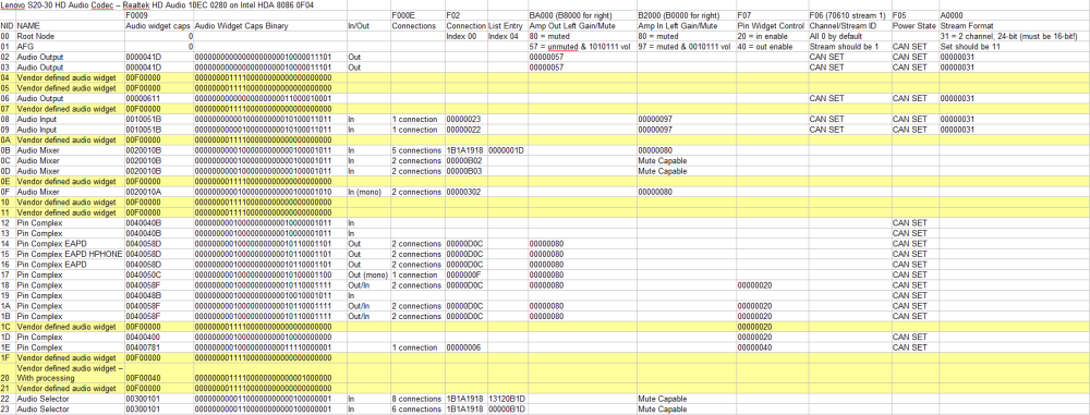 @deomsh thank you for all of this info! Notes below with @Drew Hoffman HDA.SYS renamed HDA.BAK for testing purely Watler's. 1) Noted! I will leave the PCI registers alone for now. 2) The AFG reports some GPI/O - please see codec response log file attached below for full verb parameter responses. Response on AFG is $40000005 (reports 5 GPI/O's). 3) Until now I only unmuted outputs, but tested also with combined output and input payloads as you mentioned using $00C3F03F (F:Set out+In_L+R, 0: Index 0, 3F: Unmute and volume to 3F). Also $0143F03F. No change with these. Sleeping Widget) I tried $02. No change with this. Volume) According to DAC1 at reset AmpOut is set to $57 which when checking steps settings is 0dB and unmuted. I maybe read somewhere that amp gain is added together if you also set it on mixer and pin widget (but maybe I am imagining this and instead it adds L+R channels?). I thought if I set $57 also on Mixer and Pin Widget the amp gain becomes $57 + $57 + $57 at LineOut.. I think I am wrong here maybe..? Power Verbs) At the beginning of testing I set $00170500 and also $0C and $14 to 70500 to power on the nodes to D0 state, however checking F05 readings in HDAICIN without 705 set at reset: all nodes showing $00000000 (D0 power state) so I assume not needed to be set. Maybe I am wrong here and reading $00000000 could also mean no reading at all, therefore the 705 verbs are required? So I tested with that but no difference in result. Further) That is great you have a quasi-universal HDAICOUT.HDA that works on multiple codecs! Hopefully I can help confirm some more codecs for this. Please see image here with quick lookup reference I made from GET verbs and the responses that helped me map this codec. I am lost at what the vendor defined audio widgets could be. Any idea for these? CODEC RESPONSES.TXT