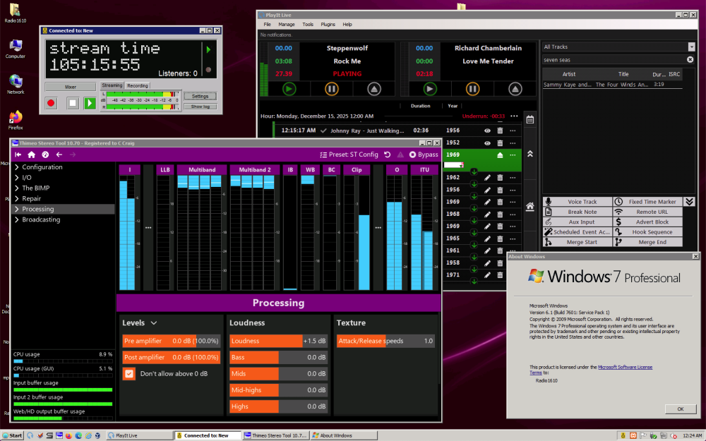 2. Hi! It's been awhile since I posted here! I'm mainly using Mac OS nowadays, but I still maintain a Windows 7 VM, and I have a Dell OptiPlex 7050 running Windows 7 Professional that I use for playlist automation (I run a small, unlicensed AM radio station; the neat part is that it's not illegal: look up Title 47, CFR Part 15, Subsection C, § 15.219 of the FCC rules). So, despite it being over 16 years old now and EOS since 2020, it's still perfectly usable and secure enough to at least get done what I'm trying to do, as you can see here: I had an earlier version of this running on XP, but unfortunately, it got too old to run the versions of the above apps I wanted (clockwise from top left: Butt, PlayIt! Live, Stereo Tool). 7 is still in that sweet spot where current versions of these things are still supported, so I'm going to use it while I still can (that said, I'm planning for an eventual upgrade to (ugh!) Windows 10 because, unfortunately, the fun doesn't last forever, and there's no Mac or Linux version of PlayIt! Live). Here's to keeping Windows 7 alive, one PC at a time! c