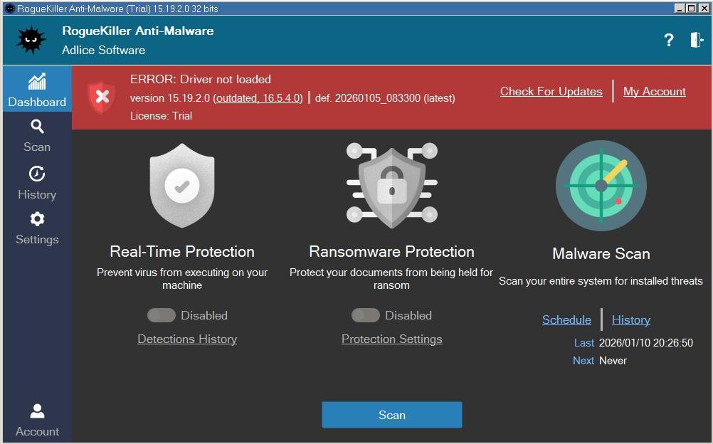22. ... Well then, not wanting to "burst anyone's bubbles" , but, perhaps, Adlice's "idea" of WinXP support is just what has been confirmed so far by your (and AstroSkipper's) tests: on-demand manual scans, only (i.e., you still need a Win7+ OS and a paid-for licence for real-time-protection to be effective); on a side note, Adlice's homepage doesn't breathe much confidence to me ; it appears they couldn't be bothered to change the copyright year to the current value: https://www.adlice.com/roguekiller/ And, FWIW, the support forum (intended to help users of the "free" version) has been turned into read-only mode: https://forum.adlice.com/index.php?topic=3890.0