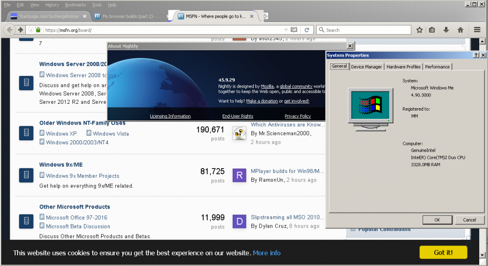 Now I'm running FF45.9esr (JS enabled) and latest KM 76.3.1 (JS disabled) on ME. I am quite surprised and I am not sure why. I believe it has to do with the KernelEx settings for the mfc*.dll/msvc*.dll files. I had tried different modes and had temporarily set mfc*.dll's to NT40 in context with "Streaming & Downloading Youtube Videos in 2020". I had problems with setting NT40. The mouse did not work repeatedly on OS start and I also had trouble shutting down. So I had set all the mfc* files to default or Base enhencements, if default didn't stick. FF 45.9 seem to run stable with JavaScript enabled, but it has the same or similar UI glitches as FF35. The extension "Classic Add-ons Archive" is installable and works. Switched: network.dns.disableIPv6 => true browser.newtabpage.enabled => false xpinstall.signatures.required => false to install unverified add-ons (already set in RT's builds) RT's FF45 build:1 point