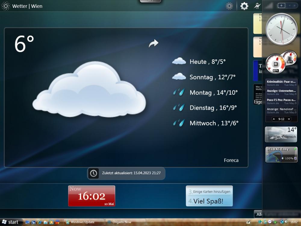 Its because the URL that is being called by the Gadget is dysfunctional since a few days: http://weather.service.msn.com/data.aspx?src=vista&wealocations=FR:DE_Berlin&weadegreetype=C&culture=de-DE The same applies to the Origami Experience 2.0 Weather Gadget, similar Domain: http://weather.partners.msn.com/data.aspx?outputview=forecast&wealocations=wc:AUXX0025&src=UMPC&weadegreetype=C&culture=de-AT Unfortunately, one can only hope that MSN will fix it. Due to Microsoft's restriction to reroute Microsoft-owned Domains via HOSTS file, it will be hard (without involving a HTTP proxy) to redirect the Gadgets to a different Server which is able to return a XML payload which can be read by the Gadget. At least for the hardcoded Origami Now Gadget. The Sidebar one can be edited in HTML/JS. I meanwhile switched to a 3rd party Gadget that is still maintained: https://00ff00.de/?page_id=658