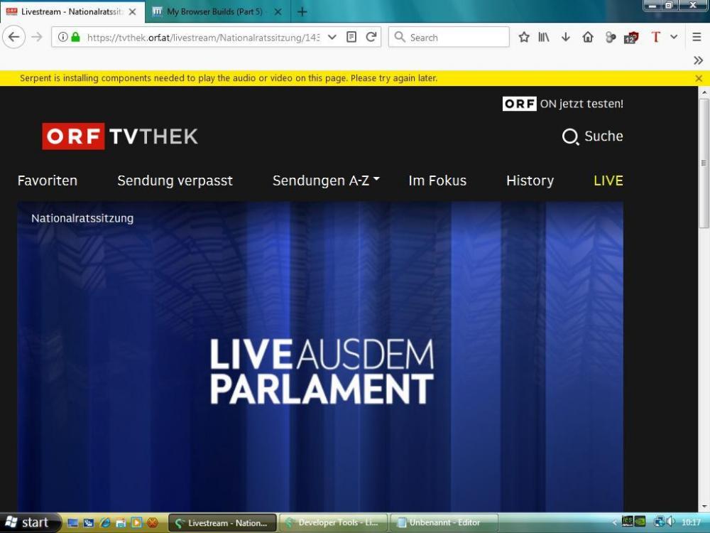 I am bad at searching in 5 Threads with 200 pages each. Did anyone try to get HVC decoded using Basilisk Serpent 52 on Vista? Austrian Broadcasting Company uses DRM protected webstreams for live TV https://tvthek.orf.at/livestreams I did find the thread about ESR52 and Adobe DRM plugin for H264. Its installed manually, but I dont think it matters here. Cannot play media. No decoders for requested formats: video/mp4;codecs="hvc1", video/mp4;codecs="hev1.1.6.L93.B0", video/mp4;codecs="hvc1", video/mp4;codecs="hev1.1.6.L93.B0", application/vnd.apple.mpegURL, application/x-mpegURL, audio/mpegurl, audio/x-mpegurl Wass there ever a 52ESR plugin for this? -