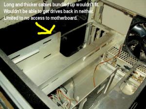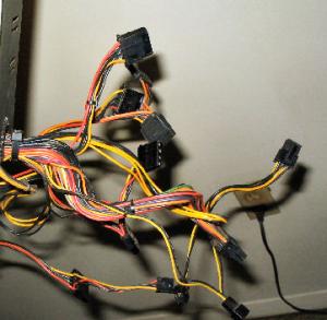 6. The first image is of the power supply. Second is of the case inside. Third is an angled shot showing where the CD/DVD drive would go. The space between the DVD guide and where a power supply is inserted doesn't give enough space to tuck in thick and long wires and I wouldn't be able to access the motherboard, nor be able to put in drives. The P and C supply that is going back is already packed up and ready to go. Wish I did get pictures of it. The cables/wires are in this thicker, fabric-like, casing and is about a foot or slightly more in length. My camera batteries just died. I don't have any spares so I'll have to wait to take more pictures I'm afraid.