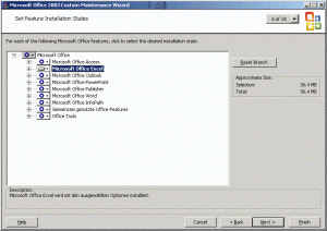 ok let's go: By installing the ork.exe you got these programs: First you install e.g. MS Word - use the 'Custom Installation Wizard' to get a MST-file. Among many customizations you got the following page - selection for MS Word already made: You can use the MST-file by running ...\SETUPPRO.EXE TRANSFORMS=...\Word.MST /qn Now your MS Office is installed. Adding any other features will be made by modifying the installation. The 'Custom Maintenance Wizard' is the right tool for it. You add e.g. MS Excel: Adding this feature to your installation you need to run the CMW-file ...\MaintWiz.exe /c .\Excel.CMW /qn Repeat the creation of a CMW-file for MS Outlook, Powerpoint, ... and don't forget the 'common used office features' and the 'office tools'. got it?