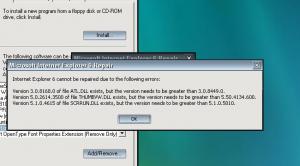IE6 repair would not complete: here's a screen shot of what IE6 repair reports. so, I updated these .dll's from old backups and then ran repair. unfortunately, repair completed without error but still same behaviour from IE6! launch it and nothing happens. nothing! somehow i don't think that sh95upd would mess with any of these files, i did update adobe reader from 6.0.1 to 6.0.6 which may have done this, but i doubt that, it has it's own copy of atl.dll in its folder. i'm thinking that installing and then uninstalling Kex may have been the problem. and here's another weird thing, i have only one app that requires Kex so far, i uninstalled Kex, but now the app runs without it! seems like it didn't fully uninstall. i think i will post this to KEx forum 2moro and see if anyone can make sense of it. don't want to reinstall ie6 if at all possible bcuz it needs so much patching...