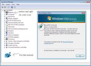 Look at the white jagged edges in the windows firewall icon.. Why isn't the blue 16-color battery icon updated in device manager? all other icons are updated though. Why still the old 16-color win95 regedit icon when a new 32-color one is present in the executable file (in xp anyway, still it's not being used there either). It's pretty amazing how a big corporation with 70.000 employees couldn't fix these small issues that would take 5 minutes to fix through resource hacker (could do it myself if i only could disable that **** windows resource protection). The product has been in development for 5 years. I'm sure there are a lot of other small things that needs to be taken care of, like the install font manager that has win 3.0 icons still, i have feelings these things wont be fixed in future updates either, as windows xp had TONS of small gui issues, and still today 5 years after its release there still there.
