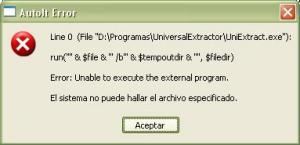 I made it work in cache mode, I had to move uniextract from the long path "D:\Programas\UniversalExtractor\UniExtract.exe", which is strange since it doesn't have spaces in the path. In "D:\Uni\Uniextract.exe" it worked. You should check what happens with long path names, they're annoying sometimes. Another suggestion would be to put the MessageBox of cache mode on top of the installer, maybe with MB_TOPMOST, so it won't get covered by the installer window, but that's a minor detail. As you probably have guessed I have spanish XP, in the first picture of the previous post, "El sistema no puede hallar el archivo especificado" means: "The system can't find the specified file". And off course, "Aceptar" means "Accept". Thank you, really, you're making a great effort in this utility!