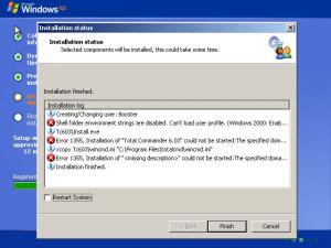 23. Status: 2, Default User is 'Booster', User Domain is '' as Group 1 (Flags = 0) Status: 2, Creating/Changing user: Booster Status: 0, Error 21: Shell folder environment strings are disabled. Can't load user profile. (Windows 2000: Enable SeTcbPrivilege privilege) Status: 2, Tc603\Install.exe Status: 0, Error 1355, Installation of "Total Commander 6.03" could not be started:The specified domain either does not exist or could not be contacted. Tc603\Install.exe Status: 2, xcopy Tc603\wincmd.ini "C:\Program Files\totalcmd\wincmd.ini" /Y Status: 0, Error 1355, Installation of "TC Settings" could not be started:The specified domain either does not exist or could not be contacted. xcopy Tc603\wincmd.ini "C:\Program Files\totalcmd\wincmd.ini" /Y Status: 2, Installation finished. This is run at T-13, will try next to run at RunOnceEx.cmd But If I run it at clean install logged in as "Administrator" everything is fine. Report back later when run from RunOnceEx.cmd.