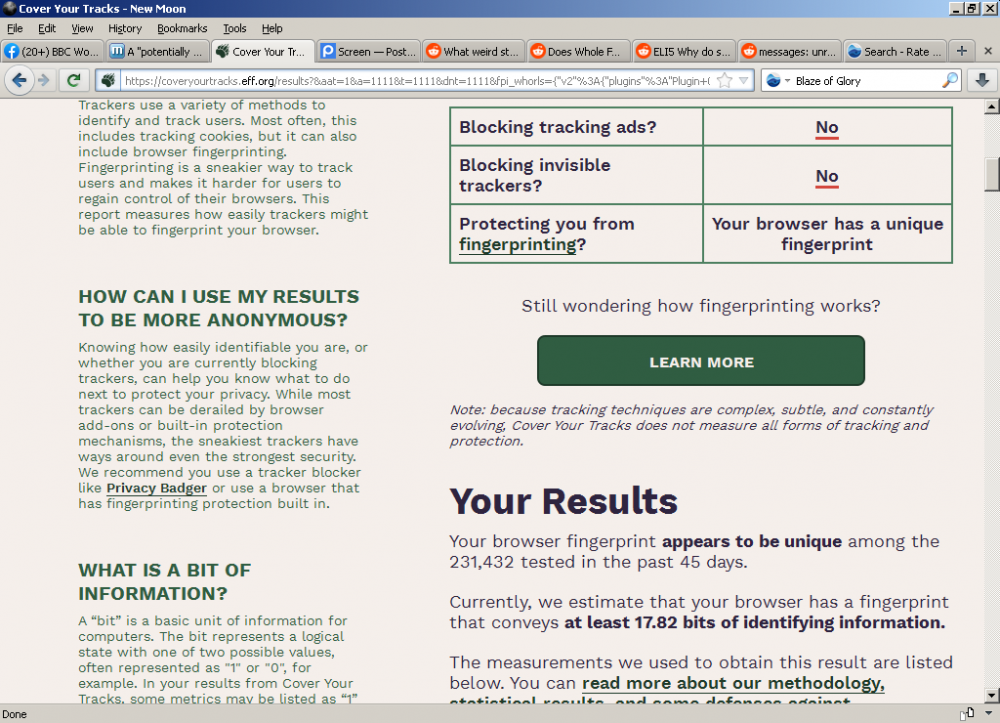 18. Cover Your Tracks somehow maxes out the information content in its elements at 17.85 bits. It read a long list of unique fonts I have installed myself, the unique browser versions of 77.7 and 6.6.6, and the existence of PDF-Xchange plugin, which together are globally unique. I'd think that would be more information.