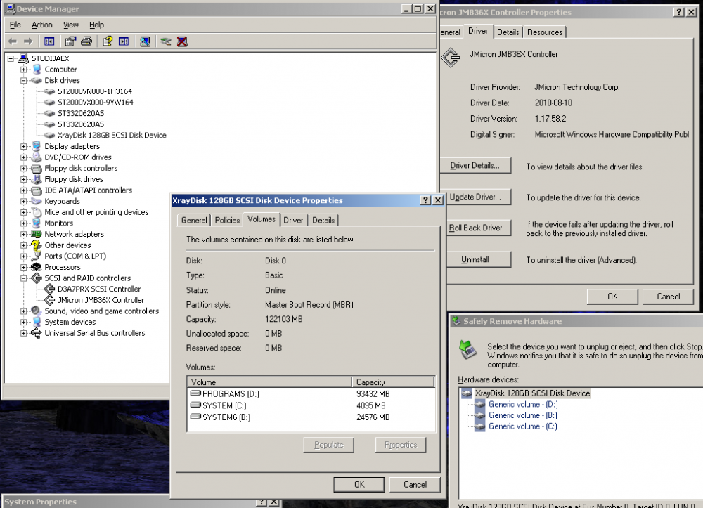 22. The drivers work. However I am not able to boot from ICH8 after installing on JMicron. I wanted to avoid disturbing the existing disks. I get the error ""Error loading operating system"". I believe this message comes from the "disk" itself. But it does not parse the boot.ini. It fails to boot on any port, and with BIOS boot order set to prefer this disk. I haven't experienced this before when moving disks. How to fix without reinstall? The partition layout is unusual 3 primary NTFS partitions aligned to 2048s: 4G(system), 24G, 91G. My old installation of XP SP1 was picked up, but of course didn't go past the logo without a hdc driver. The JMicron JMB363 driver is useless. Speed is the same SATA I at 120 MB/s. No SMART unlike in IDE mode. Apparently no NCQ. And the disk is considered removable, and shows in the system tray. Any way to hide it from there? The Intel driver with a HDD also doesn't bring any benefit. Random 4K reads with HDD rose from 0.8 to 1.4 MB/s. I've not a chance to measure XRayDisk flash memory yet, except the sequential speed of 240 MB/s on Intel.