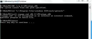 Hi All I have created this cmd file that makes a custom ghost recovery disk, however this does not work on windows 7 builds: here is teh scrip: D /s/q C:\PE\winpe_x86 cd "c:\Program files\windows AIK\tools\petools" call copype.cmd x86 C:\PE\winpe_x86 pause copy c:\PE\winpe_x86\winpe.wim c:\PE\winpe_x86\ISO\Sources\boot.wim pause cd "C:\Program Files\Windows AIK\Tools\x86\Servicing" Dism /Mount-Wim /WimFile:C:\PE\winpe_x86\ISO\Sources\boot.wim /index:1 /MountDir:C:\PE\winpe_x86\mount PAUSE Copy D:\MakePE3\Windows\System32\*.* C:\PE\Winpe_x86\Mount\Windows\System32 Copy D:\MakePE3\Icon\*.* C:\PE\Winpe_x86\ISO pause cd "C:\Program Files\Windows AIK\Tools\x86\Servicing" Dism /Unmount-Wim /MountDir:C:\PE\winpe_x86\mount /Commit PAUSE cd "C:\Program Files\Windows AIK\Tools\x86" oscdimg -n -bc:\PE\winpe_x86\etfsboot.com c:\PE\winpe_x86\ISO c:\PE\winpe_x86\winpe_x86.iso PAUSE and we get this error, see attachment please. If i manually follow the patch its all correct, so is something wrong with te commands