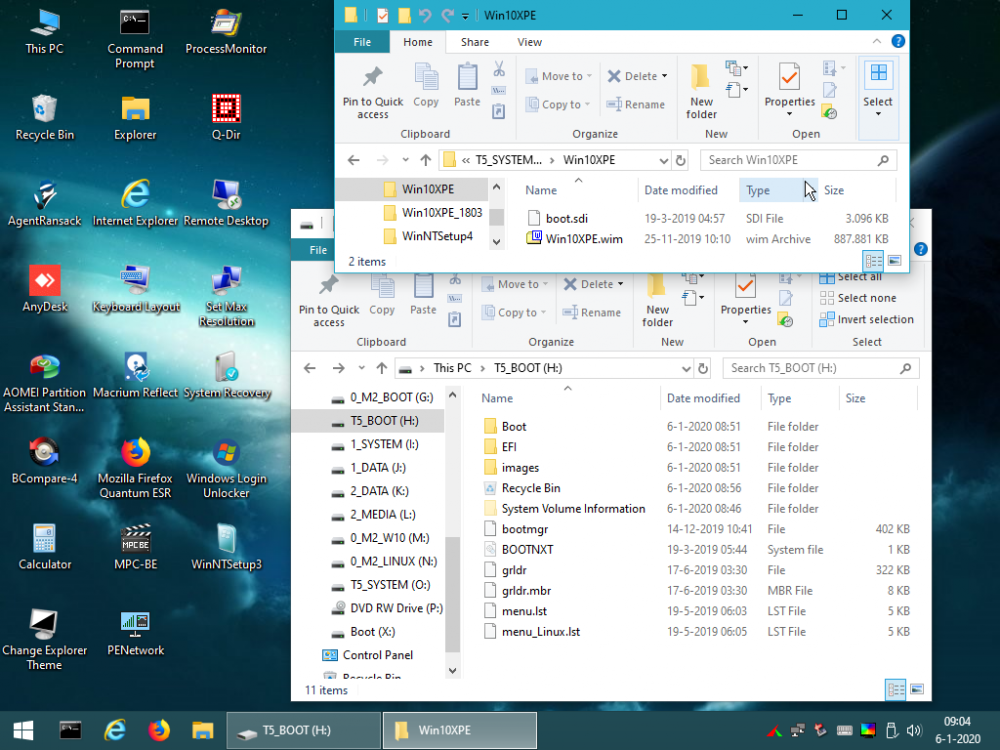 1. How to Boot from USB with WIM or VHD file located on Portable SSD Make USB - Partition Portable SSD 500 GB - SAMSUNG Portable SSD T5 500 GB with UEFI/MBR Partitioning - 1st partition 20 GB FAT32 Set Active used for Boot Manager and Grub4dos Boot files - 2nd partition NTFS used for VHD + WIM System files 1. In Disk Management remove existing exFat Volume and Create new partitions 2. MBR partitioning with 1st partition 20 GB FAT32 Set Active used as Boot Drive and 2nd partition NTFS System Drive - Instead of step 3 and 4 using UEFI_MULTI will Set Active the USB FAT32 Boot Drive 3. In admin command window run DiskPart 4. In DiskPart type list volume and select volume <FAT32 volume nr> and active and exit BIOS mode booting requires Active partition with BOOTMGR bootsector UEFI mode booting requires FAT32 partition with x64 file efi\boot\bootx64.efi Or x86 file efi\boot\bootia32.efi Downloads: UEFI_MULTI and WinNTSetup and Windows 10 x64 ISO from TechBench Or using Windows-ISO-Downloader Tool More Info: UEFI_MULTI topic and Win10_Inst in Forums MSFN and Reboot.pro and VHD_WIMBOOT and BOOTICE 1.3.3.2 At MSFN there is topic USB Format Tool and UEFI_MULTI All my projects are now available for Download as Releases at wimb GitHub Download: USB_FORMAT and UEFI_MULTI and VHD_WIMBOOT and System_Info and MBR_Backup Manual: Win10_Install.pdfand Downloads: System_Info and Unattended_Eng.zip - Use UEFI_MULTI to Add WIM file to make Portable SSD booting from RAMDISK - filename = Win10XPE.wim - Use UEFI_MULTI to Add VHD file to make Portable SSD booting with FILEDISK - filename = W10x64_1909_F.vhd - Add ISO x64 file to NTFS System Drive used by WinNTSetup for Installing Win10x64 in VHD or hard disk - Boot from USB - After beep use F8 menu - Select Win10XPE-WIM or W10x64_1909_F.vhd in Boot Manager Menu - Use WinNTSetup x64 and ISO file for Installation of Windows 10 x64 in VHD or partition of internal SSD harddisk - Swith off Defender - In WinNTSetup use R-mouse menu - Local Windows Installations and Capture Wim to make Backup WIM file How to make Win10XPE WIM file for booting from RAMDISK Download: Win10XPE Builder - More Info: see Manual Download Win10_1909_English_x64.iso from TechBench Or using Windows-ISO-Downloader Tool Mount ISO with double-click and Copy the Content of the ISO to Folder Win10_1909_English_x64 on your Harddisk In WinBuilder > Build Core > Select Run ALL Programs From RAM to get WIM file with all Programs integrated In WinBuilder > Apps > System Tools DeSelect XPE Startup (when Selected build fails) In WinBuilder Select the Folder Win10_1909_English_x64 on your Harddisk and Start building with Play button Use Win10XPE\ISO\sources\boot.wim and Win10XPE\ISO\Boot\boot.sdi for booting WIM file from RAMDISK First copy both files to folder Win10XPE located on NTFS System Drive of Portable SSD Then use UEFI_MULTI to make Boot Manager entry for the WIM Boot Image file