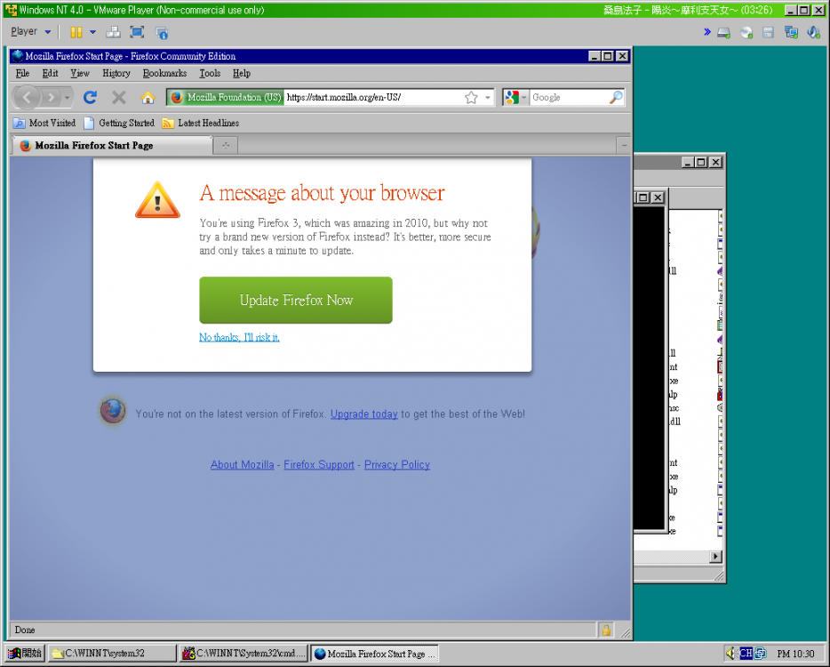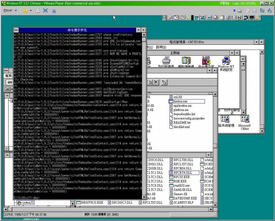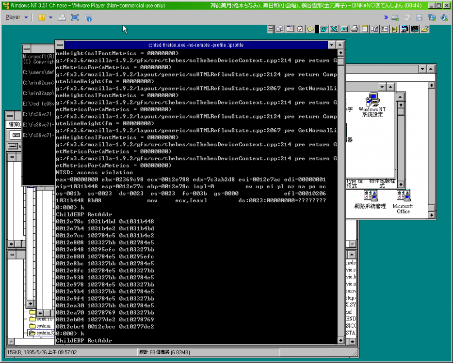 Oh nice. But mine is latest 3.6 (3.6.28) which changes alot. Still waiting for your wrapper release BTW I found that NTSD is better than WINDBG in NT 3.51, which produces better stack trace (although I still can't find root of NULL FontMetrics pointer issue now).