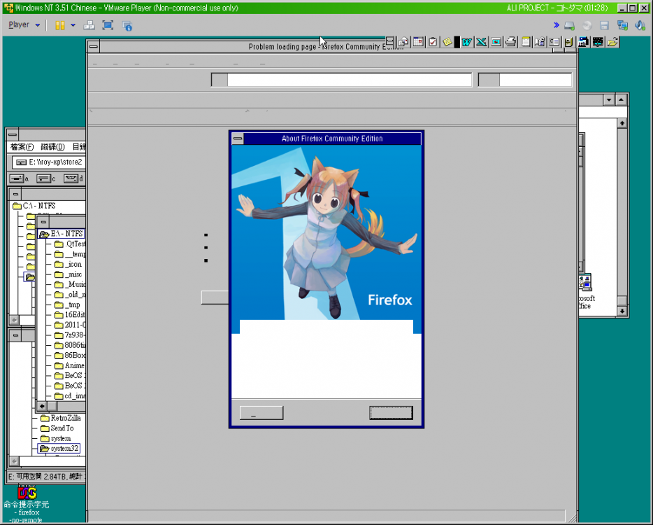 It starts now, but no text and images (maybe cairo's problem?) EDIT: With some testing, Text issue may because of usp10? EDIT2: So Uniscribe doesn't work in NT 3.51 and throws 0x8007007F EDIT3: GetCharacterPlacementW failed as well? EDIT4: Tried GetTTUnicodeGlyphIndex() from MSDN, GetTTUnicodeGlyphIndex() itself works but I found that ExtTextOutW() does not support ETO_GLYPH_INDEX in NT 3.51. If I can't find a way to convert all related code back to non-glyph way, the project will hit dead end. Test binary: http://o.rthost.cf/gpc/files1.rt/fx36vc71-20171025.7z