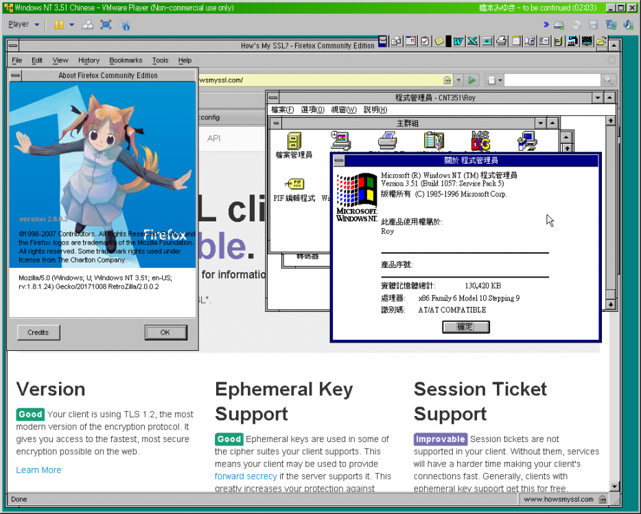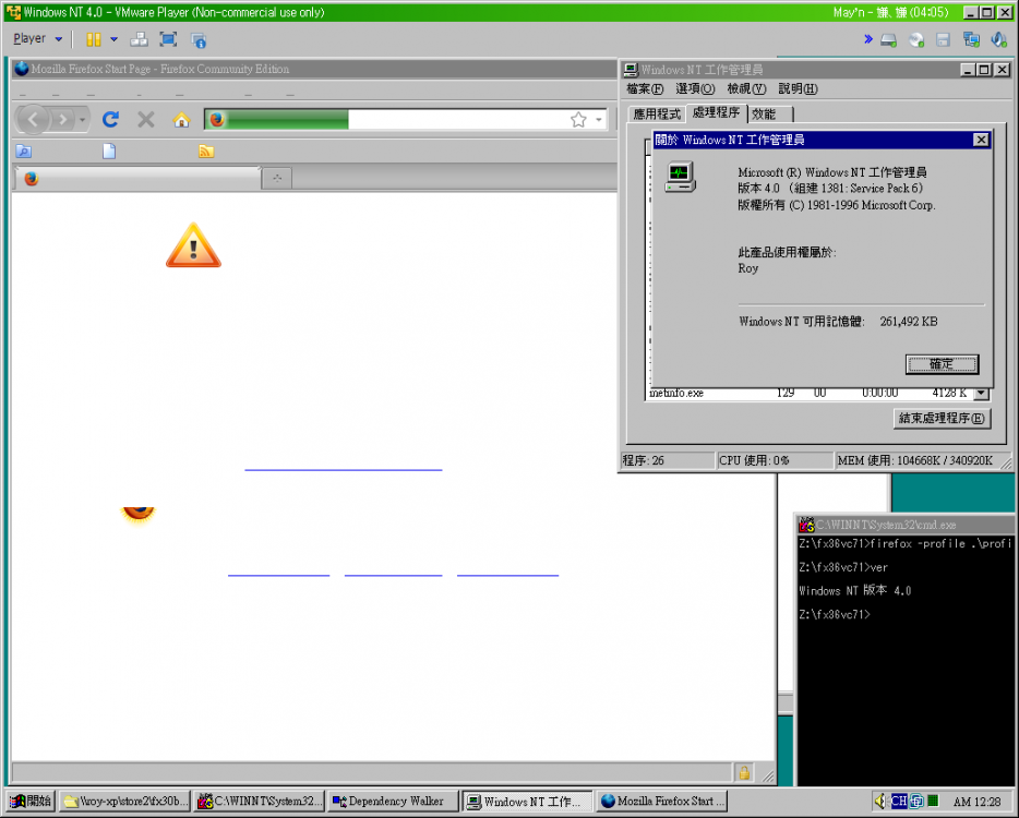 By my binaries or official rz2.0? I doesn't test my build on NT 3.51 yet. BTW I'm still trying to get fx3.6 build with VC2003(as my old effort some years ago, and now I pick it up again), and chromium ipc library hurts. EDIT: so --disable-ipc switch is used. and now struggling in widget folder. EDIT2: Build success but crash on startup, need more debugging. EDIT3: Back to origin - Build works in XP but not NT4, firefox.exe exits immediately once started on NT4. Trying to build a DEBUG build of 3.0b1 and run on NT4 to see which component causing issue. EDIT4: Seems to me Mutex problem?