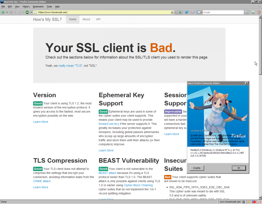 my VC2003 test build is here: http://o.rthost.cf/gpc/files1.rt/rzbrowser-tls12.7z EDIT: VC6 build some kind of works. http://o.rthost.cf/gpc/files1.rt/rzbrowser-tls12-vc6.7z but SSL is not working in my freshly installed win95 osr2. I can only use conservative optimize flags like: ac_add_options --enable-optimize="-O2 -G6" Actually VC71 build works more better in Win95 OSR2 besides SSL is still not working. See below!