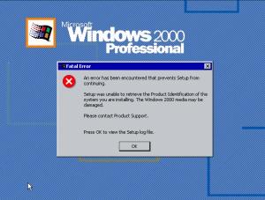 Hello! Is anyone familiar with using Fred Vorck's sp5 files? In an attempt in making a streamlined edition of my W2K I'm using them but I get a fatal error on setup. Here's a some pics I get this error whether I choose to keep or delete the .cat files. I know its not a HFSLIP specific issue because I have made a Win2K with sp4, sp4 rollup, all recent Hotfixes, WMP9 + updates, IE6.1 with all updates, DX9c, Dot net 1.1, 2.0 all patched, and a few utilities like 7-zip, RegCleanr, SystemInternals, etc...It went like butter, mostly. Only difference in the directory structure, is that I have take out the IE6 cabs and hot fixes, and put in the sp5 files into the FDVFILES directory. I am using the 2000SP4EXT for the cleanup, so would that something I should not be using with this sp5 files? Any suggestions are greatly appreciated. --Thank You--