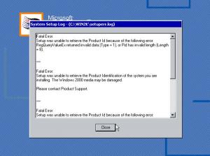 Hello Sounds good I'll give that a go. Incidentally pics take above in the first post were without the IE5 updates, I tried an install with the IE5's and got the same error, and yep English Windows 2000 Pro. My original disk is a pre- any SP release versions. From now on I'll just answer Y to both questions. Thanks for the help and I'll post back with some results. EDIT: Success! By removing the SETUPP.INI it went through the whole installation! Which brings up some questions, since the o/s didn't use that setupp.ini, did it use another setup.ini or just not one at all? What is [PID], just some sort of program identification (seems obvious)? I mean more like what do the digits 51873270 refer to? Now I did also remove the winnt.sif from the FDVFILES and left my version in the FIX directory, all thought I doubt that had any effect on whether it was going to install or not. I also slimmed it down on the DX files using only the 2 mentioned in the guide, and left out all my cabb'd applications. Here's the text from the successful install (on VM Ware). HFSLIP.7z Next I'll try an install with the programs I have all ready and my drivers, I think it should do fine. As far as any IE6, I only ever used IE to use the WU, now that I know where to get the files released the second Tuesday? of the month, I know now I don't need it. However I did like the 'Web' graphic in the upper left corner, is there any way I can get that back w/out IE? (I have a really cool pic of Angelica Bridges in a painted on Tigress outfit, I'd hate to see that go to waste). Thanx AGAIN for the help!