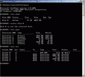 That seems right for Windows PE 2.1. Thanks. Here's a laptop HDD - repartitioned after it was severely damaged when my wife inserted a CD into the optical drive.Disk Management (Win7 RC1): diskpart (WinPE 2.1): First the active primary (c:), then the logicals (d: and e:), then the remaining primaries (f: and g:). Awaiting what cyberwatchers has to offer....