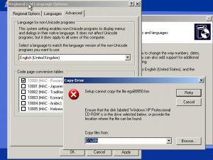 Found a bug.. Don't know if this has allredy been reported - but i cant bebothered to read everypost. When i tryed to set "English (UK)" as the language options during setup it worked in "Regional Options" and "Languages" but when i came to the "Advanced" tab to change it from English US to UK (For non-unicode programs) i got an error about missing files. The files it asked for were: app850.fon cga40850.fon cga80850.fon ega40850.fon ega80850.fon vga850.fon Theres a screenie attached to this post of Virtual PC. This isn't a real problem coz i sopose you could just put the files manually into the iso and rebuild the iso.. Later, Chris.