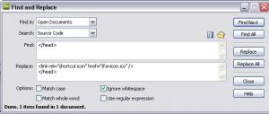 I don't think there is a way to add favicons by CSS. You could try to use a server side script (like PHP, ASP or Server side include (SSI)) if the server support it. Internet Explorer automaticly looks for a favicon.ico in the server root if you bookmark the site, but IE is the only browser that do that. If you can't use any server side scripts you will have to insert it to every html page. You can open all files in Dreamweaver and use the find and replace function like in the picture, just hit replace all, It will add a "<link rel="shortcut icon" href="/favicon.ico" />" before every "</head>".