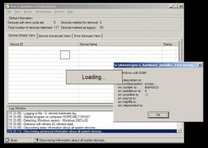 oups its hardware_config.xml not hardware.xml noe it gives autoit error and the wizard still pops up and the log says 16:27:02] - Started program on computer HOME-84C113F3A7. [16:27:02] - Detecting Windows version - Windows 2003 x32 [16:27:02] - Directory with drivers (G:\drivers) exist. [16:27:03] - Discovering basic information about all system devices.. [16:27:12] - Discovering advanced information about all system devices.. [16:27:17] - Cleaning up devices list from non-essential devices... [16:27:20] - Building up simple devicelist... [16:27:25] - Building up advanced devicelist... [16:27:36] - Building up error devicelist... [16:27:36] - Found process rundll32.exe with PID 1828. Ignoring that process! [16:27:37] - Setting path into registry using RegistryDevicePath method. [16:27:50] - Device Path in registry currently has 36669. Maximum path is 4096 characters. [16:27:50] - It is suggested, that if Device Path is longer then 4000 characters you should use SetupCopyOemInf method. [16:27:50] - If you don't want to do so you can cut some dirnames so those will be shorter, cutting down the number of characters overall. [16:27:50] - Drivers path was set successfully into registry. [16:27:51] - Removing unknown hardware from system. [16:27:51] - Removing hardware ID: PCI\VEN_10DE&DEV_0064&SUBSYS_57001462&REV_A2\3&13C0B0C5&0&09 [16:27:53] - Removing hardware ID: PCI\VEN_10DE&DEV_006A&SUBSYS_57001462&REV_A1\3&13C0B0C5&0&30 [16:27:53] - Unknown devices were removed successfully. [16:27:54] - Forcing system to detect Plug & Play Devices. -