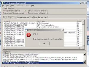 no the previous is still there Com Error with DOM err.description is: err.windescription is : evises.. err.number is: 80041013 err.lastdllerror is : 0 err. scriptline is: -1 err.sourse is: err helpfile is: err.helpcontext is: and now i also have the autoit error my .xml <?xml version="1.0" encoding="utf-8"?> <settings> <basic_configuration> <choice>Automatic</choice> <drivers> <drivers_drive>RELATIVE</drivers_drive> <drivers_directory>\drivers</drivers_directory> <drivers_packed>No</drivers_packed> <drivers_copy>No</drivers_copy> <drivers_copy_path></drivers_copy_path> <drivers_copy_delete>No</drivers_copy_delete> <options> <method>SetupCopyOemInf</method> <registry_path>Begin</registry_path> <problem_ids>01,10,18,24,28,37,39</problem_ids> <update_all>No</update_all> <plug_and_play> <option>Internal</option> <time_to_wait>15</time_to_wait> </plug_and_play> <shutdown> <auto_reboot_when_nessecary>No</auto_reboot_when_nessecary> <auto_reboot_when_done>No</auto_reboot_when_done> <auto_login>Yes</auto_login> <notify_when_done>Yes</notify_when_done> </shutdown> <time_to_run>0</time_to_run> <force_run>No</force_run> <device_manager>No</device_manager> </options> </drivers> <log> <log_overwrite>No</log_overwrite> <log_to_file>Yes</log_to_file> <log_filename>hardware.log</log_filename> <log_path>$ProgramDir</log_path> <log_option>Simple</log_option> </log> <gui> <hide_legacy_devices>No</hide_legacy_devices> <fade_in_effect>No</fade_in_effect> </gui> </basic_configuration> </settings> my log [16:47:36] - Started program on computer HOME-84C113F3A7. [16:47:36] - Detecting Windows version - Windows 2003 x32 [16:47:36] - Directory with drivers (G:\drivers) exist. [16:47:37] - Discovering basic information about all system devices.. [16:47:38] - Discovering advanced information about all system devices.. [16:47:40] - Cleaning up devices list from non-essential devices... [16:47:40] - Building up simple devicelist... [16:47:41] - Building up advanced devicelist... [16:47:43] - Building up error devicelist... [16:47:43] - Found process rundll32.exe with PID 2008. Ignoring that process! [16:47:43] - Integrating drivers with SetupCopyOemInf method. [16:49:26] - SetupCopyOemInf method completed. No drivers were integrated. [16:49:26] - Removing unknown hardware from system. [16:49:26] - Removing hardware ID: PCI\VEN_10DE&DEV_006A&SUBSYS_57001462&REV_A1\3&13C0B0C5&0&30 [16:49:27] - Unknown devices were removed successfully. [16:49:27] - Forcing system to detect Plug & Play Devices. i uninstalled the audio driver and my vga and tested it didnt found any driver for these -