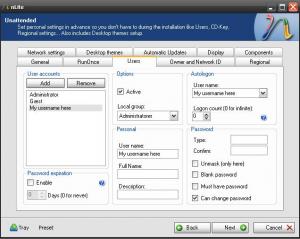 Hello guys.. I have a new problem I have finnaly made and installation that does not restart the computer, but of course i have another problem now. It keeps doing funny stuff with the users. When i boot windows, at first i got a login screen (see attachment 1, called user 2) In english the text says "You can not logon, the reason is a limit on your account" I dont want that screen there.. When i press ok, it takes me to the Normal windows xp logon screen. But now there are two users One called "Owner" and one called my name. First of, i dont want the user called "Owner" Second, i want it to log onto my user when i start the computer. Attachment two (called "user") shows what i wrote in the unattended part of nLite. Would somebody mind telling me what i should write, so that it works Thanks