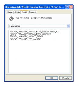 Hi, I found this with everest - hope it's what you meant? Win XP Promise FastTrak 376 (tm) Controller PCI\VEN_105A&DEV_3376&SUBSYS_809E1043&REV_02 And the attachment below - it's an image from my windows device manager under promise controller - i guess it's the same thing but there are three more lines in addition to that one above... mmainio -