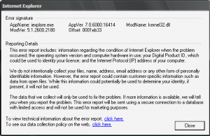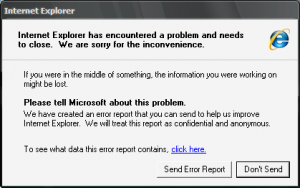 Sorry guy for letting any misunderstanding invades. Firefox is the best, which is known for its fast and efficient service, as quoted in many websites. I do have a Firefox 2.00, and man, even the Grand Paradiso! If you don't know about this evoluted Firefox, better check it out. But guy, we are borned to cope every problem without letting it a chance to escape, aren't we? In other context, are you going to leave your system go tearing out? When I hit Don't send button the IE windows turn off automatically. Well so, turn off Error Reporting Service do not really help. So teach me if you know to cope with this problem. Thank you very much.