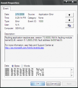 DigeratiPrime, This is the image. Bytes 0000: 41 70 70 6c 69 63 61 74 Applicat 0008: 69 6f 6e 20 46 61 69 6c ion Fail 0010: 75 72 65 20 20 69 65 78 ure iex 0018: 70 6c 6f 72 65 2e 65 78 plore.ex 0020: 65 20 37 2e 30 2e 36 30 e 7.0.60 0028: 30 30 2e 31 36 34 31 34 00.16414 0030: 20 69 6e 20 6b 65 72 6e in kern 0038: 65 6c 33 32 2e 64 6c 6c el32.dll 0040: 20 35 2e 31 2e 32 36 30 5.1.260 0048: 30 2e 32 31 38 30 20 61 0.2180 a 0050: 74 20 6f 66 66 73 65 74 t offset 0058: 20 30 30 30 31 65 62 33 0001eb3 0060: 33 0d 0a 3.. Words 0000: 6c707041 74616369 206e6f69 6c696146 0010: 20657275 78656920 726f6c70 78652e65 0020: 2e372065 30362e30 312e3030 34313436 0030: 206e6920 6e72656b 32336c65 6c6c642e 0040: 312e3520 3036322e 31322e30 61203038 0050: 666f2074 74657366 30303020 33626531 0060: 0a0d33 Thanks for kindly helping