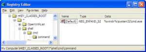 util or shell extension to have dockable cmd bar in XP?lqs_lfzz replied to Leeoniya's topic in Windows XP Well, try to import this registry key. You can also change to [HKCU\Directory] or other. Windows Registry Editor Version 5.00 [HKCU\*\shell\cmd\command] @=hex(2):25,00,77,00,69,00,6e,00,64,00,69,00,72,00,25,00,5c,00,73,00,79,\ 00,73,00,74,00,65,00,6d,00,33,00,32,00,5c,00,63,00,6d,00,64,00,2e,00,65,00,\ 78,00,65,00,00,00