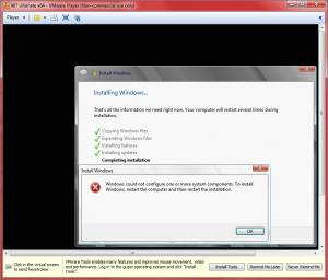 I recently purchased a W7 DVD with Ultimate x64 with included Service Pack 1. I used my usual Unattended answer file (AutoUnattend.xml), but am getting error messages from Setup. First I get a dialog to select the image to install even though I have specified it in the answer file, here: <ImageInstall> <OSImage> <InstallFrom> <MetaData wcm:action="add"> <Key>/IMAGE/NAME</Key> <Value>Windows 7 ULTIMATE</Value> </MetaData> </InstallFrom> <WillShowUI>OnError</WillShowUI> <InstallToAvailablePartition>false</InstallToAvailablePartition> </OSImage> </ImageInstall>Screen shot of message attached. After clicking Next, Setup continued and restarted. During "Completing installation", I got the "...cannot configure..." message, attached. I have exported only the Ultimate image into the Install.wim file and injected all current updates and IE9 but no drivers. I have also disabled several components. I used "maxXPsoft Win 7 Replace Boot, Login, Shutdown screens" batch files which I got here some time ago. I had to adjust them for SP1 in one case. The holidays are here and I am running out of time, but I will do a lot more testing when past the immediate crunch. This will include starting from a fresh Install.wim file with only IE9 and updates and go from there. However, I do hope someone has encountered these problems before and can suggest some cure(s). I suspect the dialog asking me to select an install image has to do with what I call the image in the answer file (<Value>Windows 7 ULTIMATE</Value>), but searching the Internet offered no help. The imagex info showed the same name for the SP1 image as non-SP1. Thanks for your time and help. Enjoy, John. EDIT: The testing was done on a VM under VMware Player. It worked fine before I started using the DVD with SP1 embedded. EDIT: Looks like I corrected the problem of being asked for the image. I exported the image again and was real careful to name it "Windows 7 ULTIMATE". EDIT: I created an ISO with no updates, no IE9 and no maxXPsoft stuff and it installed OK. I will try adding some things to see which it is. EDIT: After thinking some more but not doing any more testing, I suspect the modified files from maxXPsoft . In particular I wonder if FirstUXRes.wim has not changed version number with SP1. I had to change the folder name (contains the version number in the name) to get the batch file to run without errors. After the time crunch is past, I will do some more looking and testing.