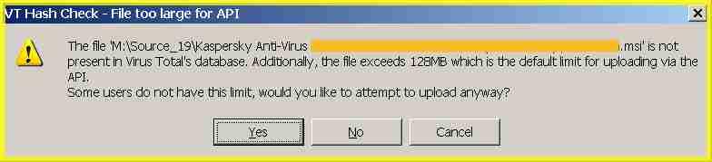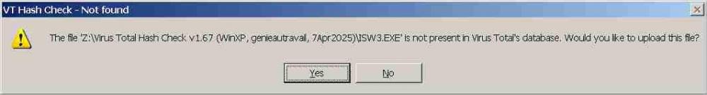 I have test-installed VT Hash Check 1.67 (WinXP, genieautravail, 7Apr2025) on my old Inspiron 7500 laptop (Pentium 3, SSE-only). The program installs and works fine under SSE-only. The installation was into a dedicated sandbox of Sandboxie v5.22. I also created a special desktop shortcut, which loads and runs the Settings window in the sandbox, and pasted my API Key into the sandboxed Settings window. I then edited the registry so that I could run VT Hash Check in the sandbox by just -> right-clicking on the file to be checked -> Check File Hash, the same handling as when VT Hash Check is installed and run normally, outside of a sandbox. The reason for installing and running VT Hash Check in a sandbox was to identify any undesirable results, such as unusual files added to the sandbox. The yellow frame in the screenshot above indicates that VT Hash Check v1.67 is running in a sandbox. The message indicates "the file exceeds 128MB which is the default limit for uploading via API". Not sure whether this is still the current API limit. Details about creating a shortcut to the program in the sandbox and about the registry entries for starting the sandboxed program with a right-click entry added to the context menu of all file types will eventually be posted in the topic "Sandboxie under Windows XP". I found nothing conspicuous during my testing of VT Hash Check in the sandbox, the program is definitely OK. It's a very useful program and easy to use. -