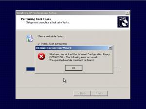 When I install XP SP-3 from an nLite modified source, I get an error message about ICFGNT.DLL (see attached JPG) during the Final Tasks portion of Setup. When the system reboots, There is no desktop background, none of the standard web backgrounds are available, and about half of my Start Menu items are missing. I've tried dozens of combinations of settings and tweaks, renaming or not renaming the Administrator account, loading or deleting OOBE, and having OOBE enabled or disabled. The error message mentions Internet Connection Wizard, which I have not deleted or disabled. The ICW error message doesn't always appear, but the other symptoms do. Also, it's not that I care that much about desktop backgrounds, it's just a consistent symptom. And, yes, I'm starting from an OEM Windows XP Pro x32 source each time. I'm perplexed, to say the least. Any help will be greatly appreciated. Thanks. Oho Last_Session.ini