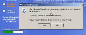 6. I have tried to do a silent install of the new RealVNC Enterprise edition 4.4.1 but a message pops up asking to configure the Windows XP Firewall to automatically work with RealVNC. I have successully integrated previous versions into Windows XP but the new 4.4.1 now hangs at that question. here is the InF I found from a previous version and that always worked so far but now a box pops up asking to say yes or no during install to configure RealVNC with the Windows Firewall. any suggestions? [EditFile] I386\SVCPACK.INF,SetupHotfixesToRun,AddProgram [AddProgram] RealVNC441.exe /VERYSILENT /SP-