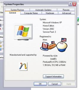 Excluding the silly pictures covering my serial number. I was surprised it says Version 2002 when the Service Pack 3 is form 2008. Also, Windows Messenger, IE, and Outlook Express were all present upon completion of my nLite installation. I specified those components be removed. I should note that my installation was not problem free. Just as XP looked like it was about to finish installing, the computer would restart and I would have to do the same process over again. I allowed this to occur several times. So finally I swapped out the streamlined CD and put in the original CD that came with PC, before quitting the installation and restarting the computer. Then it prompted me to insert the Windows XP Service Pack 3 CD I had created so I put that back in and the same thing happened. It looked like it was fully installed and then it restart and prompted me to choose a spot to install XP. So then I took the CD out and restarted and then it went right to welcome screen and everything looked fine. Except my wireless USB network adapter's driver had not installed as it should have. And the inclusion of IE, Outlook, and Windows Messenger has me perturbed. Thanks for any help!