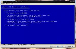 Hey. I created a new slipstreamed Windows XP install disc using the latest nlite. I've done this a couple times before. This time i've slipstreamed SP3 as well as a few utilities and updates. But this time while doing it i've come up with some errors. When testing the disc in Sun xVM VirtualBox I get lots of errors when trying to install. Almost every file comes back saying "Setup cannot copy the file *.*". The first file that pops up is "acc_dis.chm", so I expanded all the "in_" files then used Notepad++ to try and find a reference to this this file in all the ".inf"s. It comes up twice with reference to settings for it, but theres nothing saying it needs to be copied over. The same goes for the next file "access.chm" and the next ... and the next .. I'm literally holding down 'esc' and hundreds of files are popping up. Whats even stranger is that "acc_dis.chm" is a help file, and I told nlite to remove all help files, so why is it trying to copy them? Both "acc_Dis.chm" and "access.chm" popped up in "defltwk.inf" and "dwup.inf". Under 'File Security' and 'individual File Settings' respectively. Another file "blue_ss.dll" doesn't get a hit at all. It isn't reference to in any of the ".inf"s Does anyone have a solution for me? I've tried resetting BIOS already and running memcheck etc. I would put this down to a bad burn, but i've burnt the disc off 3 times using ImgBurn and verified each disc. Thanks
