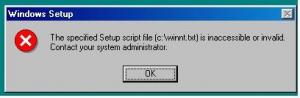1. Thank you all for this site. I've really learned a lot, and, while I'm a bit slow on all this, hope to learn much much more. 1a. I'll do my best to explain. Sorry if it's wordy, but I tend to get that way. Better too much info than not enough, I always say! 2. Issue is as stated while trying to utilize Gosh's downsize method, among other things, requiring I run the winnt32.exe with the /noreboot switch and the /unattend switch. When I try this, I'm getting a message stating that the file is unvalid or inaccesable. I'll attach an image. The exact syntax I'm using from the Run line (does the same thing whether WINXP or WIN98 running on VMWARE 4.0.1) is winnt32.exe /dudisable /noreboot /unattend:c:\winnt.sif where c:\winnt.sif is my unattended setup file. I've tried it with many different setup files, text files, etc. and always see the same thing. More background; Interestingly enough, the installer I'm using works peachy as a CD, slipstreaming, installing all hotfixes, etc. etc. But when I try to use it as described by Gosh for downsizing source (ie with the /noreboot switch) it only installs WinXP; no hotfixes nor $OEM$ folder copy. I believe the resolution to this is that I must force the lil' devil to follow my unattended setup directions. If it matters, here's my winnt.sif file; ;SetupMgrTag [Data] AutoPartition=0 MsDosInitiated="0" UnattendedInstall="Yes" [Unattended] FileSystem=* UnattendMode=FullUnattended OemSkipEula=Yes OemPreinstall=Yes UnattendSwitch="yes" TargetPath=\WINDOWS [GuiUnattended] AdminPassword= EncryptedAdminPassword=NO AutoLogon=Yes AutoLogonCount=1 OEMSkipRegional=1 TimeZone=20 OemSkipWelcome=1 [UserData] ProductID=*****-*****-*****-*****-***** FullName="***" OrgName="****" ComputerName=* [Display] BitsPerPel=32 Xresolution=800 YResolution=600 Vrefresh=75 [Identification] JoinWorkgroup=xxx.xxx [Networking] InstallDefaultComponents=Yes [Componants] msnexplr=off [GUIRunOnce] %systemdrive%\install\hotfixes\hotfixes.cmd Any help you can offer is swell! Thanks again, all!