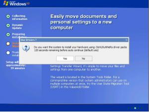 This is not my method. Major thanks to idle.newbie and hp38guser, as most of this is their work. Thanks also go out to Pyron for making SetupCopyOEMInf.exe and WatchDriverSigningPolicy.exe, which are used in this method. I based it on the older AutoIT method (HERE). In certain scenario's I needed to skip the drivers part. This wasn't possible in neither the AutoIT method or the 'simple method'. solution: modifie the AutoIT method with a gui messagebox asking if u wish to use the drivers. Being an unattended cd this messagebox is only shown for x seconds beforce continuing with yes. This is what you have to do: 1. Download the attached zip file, and unzip to your drivers dir on the cd. (There are 4 files in the zip: Drivers.au3, Process.exe, SetupCopyOEMInf.exe, WatchDriverSigningPolicy.exe) Download 7za.exe & Autoit.exe found in the other method. (These files will run from the CD, and are never copied to the Hard Drive.) 2. Open up winnt.sif (located in i386), and add two lines under [GuiUnattended], as shown below: [GuiUnattended] DetachedProgram = ".\system32\cmd.exe" Arguments="/Q /C FOR /F %I IN (%SystemRoot%\SYSTEM32\$WINNT$.INF) DO (FOR %J IN (%Idrivers) DO (IF EXIST %J (start /min /D%J Autoit3.exe Drivers.au3)))" note:I am using a folder called /drivers in the root of the cd, if you use another folder change the path in the above code 3. Place your 7z driver packs in the same directory %cdrom%\drivers Notes: -= Plug'n Play devices are detected during Windows Setup after the DetachedProgram stage (which is when this script is run), so Windows Setup will detect and install all applicable drivers. -= Any type of folder names can be used. (Don't worry about spaces in the folder names.) For example: "Wireless Card Drivers" will work just as well (even though there are spaces in the name) as "WiFi_Drivers". I've personally tested this method, and it works perfectly (I installed laptop OEM drivers, PCI card drivers, etc. - all without a problem). -= Also, please note this method will not work for MassStorage Device drivers. -= This method does not require any files to be copied over the the HDD - it runs totally from the CD. drivers.7z