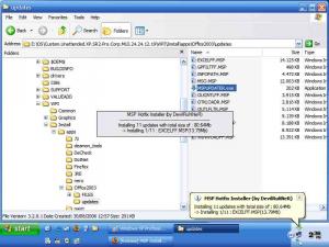 This does exactly as the topic title says. It installs .MSP files it finds in the same folder. I quickly wrote this AutoIT program so that I can install the .MSP office2k3 hotfixes in a easy fashion. Future hotfixes just go in the same folder and the program will detect them, and install them. Try it out, let me know what you think... 1.Just compile it into an exe(or leave it as source and put autoIT3.exe with it to execute) The normal AutoIT fashion;) 2.create a folder somewhere(doesn't matter where) 3.Put in that folder this program/script along with the .MSP files you extracted from the hotfixes. 4.Simply execute the program/script and watch it install your hotfixes Feel free to add/modify this to your wishes... ***Maybe this can be moved to member contributed projects? MSPUPDATER_SOURCE.au3