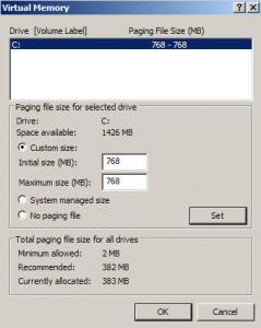 Hiya, I've tried VMWare. My page file is stuck at 383MB now =\. the attached screenshot will give a better idea of my problem. Thanks in advance. Notice the pagefile is set at 768-768MB, but the allocated is 383MB . I've restarted many times already. -