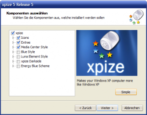 Problems with R5: * The "< Back" button problem is still there. - Maybe you can do an refresh for the progress bar page (so the it always shows 0% at the beginning), if it is entered, so that there is no confusing undocumented delay anymore. * There is an unhandled exception, which can be reproduced: - Click "Next >" until the visual style page appears - Click "Advanced" for the component page - Click "< Back" until the very fist page appears again - Click "Next >" until the component page appears again - Now click "Simple" => exception occurs * If under component page no visual style is selected, xpize installes the selected style from simple page anyway. But it should be possible to select the icons and extras only - with no installation of a visual style. Additionally: it should be possible to select more than one visual style on component page - xpize should copy all selected visual styles to the "ressources" folder, but install only the one wich was selected on simple page.