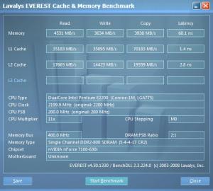 Microsoft Windows [Version 6.0.6001] Copyright © 2006 Microsoft Corporation. All rights reserved. Windows System Assessment Tool > Command Line 'winsat mem -v' > DWM running... leaving it on > System processor power policy saved and set to 'max performance' > Running: Feature Enumeration v1.0.0.0 '' > Gathering System Information > Run Time 00:00:00.70 > Operating System : 6.0 Build-6001 > Processor : Intel® Pentium® Dual CPU E2200 @ 2.20GHz > TSC Frequency : 2200400000 > Number of Processors : 1 > Number of Cores : 2 > Number of CPUs : 2 > Number of Cores per Processor : 2 > Number of CPUs Per Core : 1 > Cores have logical CPUs : NO > L1 Cache and line Size : 32768 64 > L2 Cache and line Size : 1048576 64 > Total physical mem available to the OS : 3.99 GB (4,293,206,016 bytes) > Adapter Description : NVIDIA GeForce 8800 GTS > Adapter Manufacturer : NVIDIA > Adapter Driver Version : 7.15.11.8048 > Adapter Driver Date (yy/mm/dd) : 2008\11\12 > Has DX9 or better : Yes > Has Pixel shader 2.0 or better : Yes > Has LDDM Driver : Yes > Dedicated (local) video memory : 297.06MB > System memory dedicated as video memory : 0.00MB > System memory shared as video memory : 1791.62MB > Primary Monitor Size : 1680 X 1050 (1764000 total pixels) > WinSAT is Official : Yes > Running: System memory performance assessment v1.1.0.1 '-v' > Block size specified as : 2MB (2097152 bytes) > Max Sample Size : 65536 > Min Sample Block Size : 10 > Number of Threads : 2 > Page Size Granularity : 0x0000 > Block Size : 2MB (0x200000) > Destination Offset : 64B (0x0040) > Run Time 00:00:05.20 > Memory Performance 3539.15 MB/s > Total Run Time 00:00:06.88 > The System processor power policy was restored I'll check out that KB and see what it has to say.