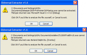 i have several packages that im trying to extract and the keep coming up with errors like (see picture) note both diff errors here are 2 of the problem installers which refuse to fully extract(ill post their files sepretly) note for the disk keeper it has xp version spicific installers after initial package but i am unsure wut one i have if it x64 or x86 also certian installers(which i deleteted and cant remember) say file type supported but extraction failed every time i try them y is this happening