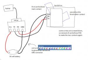 15. Hey guys, is this the correct way to wire everything up? My questions are 1) am I grounding the GND pin from the hard drive properly (is the GND right next to the TX on the hard drive?)? I am going to hook up the SATA power source directly to the drive, and I don't want to stick a ground into there. Someone mentioned that after they connected the SATA power cable, their 3V battery exploded, so I want to be sure this is correct. Are both power sources necessary? It sounds like if I use just the 3V it is enough. If I use just the SATA, then I have to ground it somehow (not sure how). And 2) have I placed the cards in the correct place, to block the motor? I heard there were two areas, the motor and some other part, and both should be blocked off. On the 500gb model I have, there's this little foam cushion thing. I can stick something at the motor (center part), but on the other contact, it becomes difficult, so I'm not sure how to approach this. Thanks, - Eli