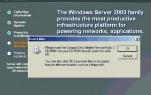 2. I have a problem when installing Windows 2003 R2 SP2 Standard or Enterprise editions through the virtual media option in iLO2 on an HP DL380 G5. The iLO 2 firmware is 1.70. The media mounts, completes that text mode installation, reboots the server and starts the GUI mode. At T-39 (Installing Windows) an Insert Disk message appears telling me the following: "Please insert the Compact Disc labeled 'Service Pack 2 CD-ROM' into your CD-ROM drive (E:) and then click OK." I click on OK and the file that it wants is 'NT5INF.CAT' and it is attempting to copy it from E:\I386. This is a multi-boot msdn cd as supplied by Microsoft. If I alter the path to the correct location as it is on the CD, then it copies that file and prompts for the next one. This only happens when using the Virtual Media in iLO2, either by mounting an Image or a CD. The installation works fine if the CD is run from the physical CD-ROM on the server. It also works if run from Microsoft Virtual PC or Sun VirtualBox. I also have this issue with the multi-boot DVD that I created. I've even tried altering the paths in the LAYOUT.INF file, but the same problem happens. Again this DVD does not have any problems when installing directly from the physical CD-ROM on the server or when used in Microsoft Virtual PC or Sun VirtualBox. The pop-up box image is attached. Any help on this would be appreciated.